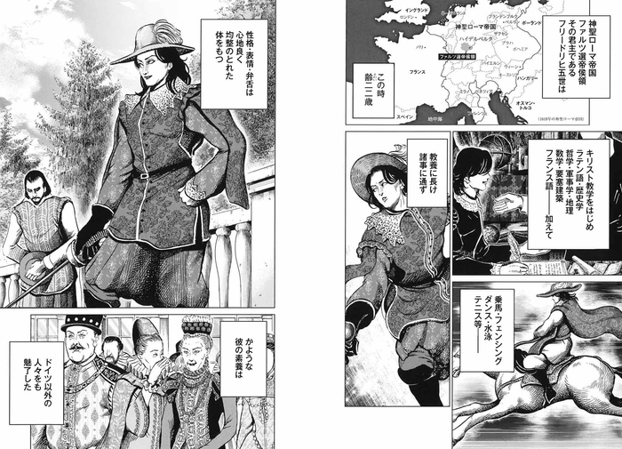 この戦争には、神聖ローマ皇帝フェルディナント2世以下、ファルツ選帝侯フリードリヒ5世、ボヘミアの傭兵隊長ヴァレンシュタイン、スウェーデン王グスタフ=アドルフなど、日本の戦国時代や三国志にも劣らない個性的な人物が多数登場します。新連載ではキャラの立ったこれら魅力的な人物たちの群像劇としてストーリーが展開していきます。