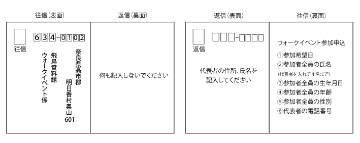 送付先 〒634-0102奈良県高市郡明日香村奥山601 飛鳥資料館ウォークイベント係