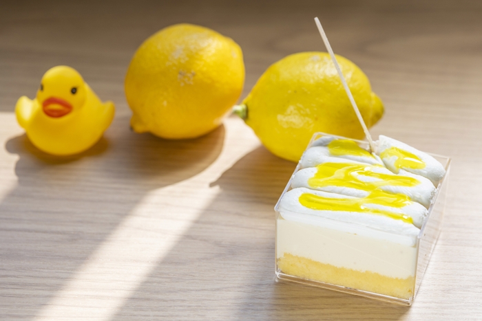 スクエア型が可愛い「熱海レモンレアチーズBOX」は、スポンジ生地にふわっと軽やかなレアチーズムースとクリームを合わせた3層仕立て。熱海レモンのシロップがアクセントになっており、甘酸っぱく爽やかな味わいです。