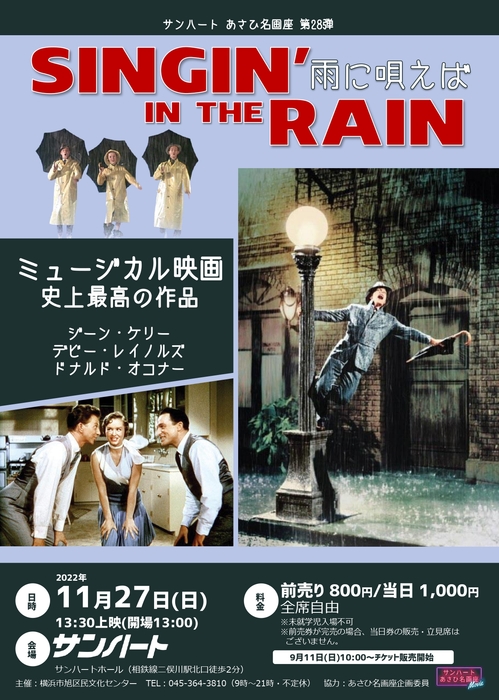 横浜市旭区民文化センター主催、サンハートあさひ名画座第28弾『雨に唄えば』が2022年11月27日 (日)に横浜市旭区民文化センター サンハート ホール(神奈川県横浜市旭区二俣川1-3二俣川ライフ5F)にて開催されます。