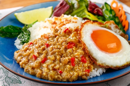 ごはん、パン、サラダなどにのせるだけで、手軽に主食や主菜が完成する、便利なガパオです。鶏そぼろ、たまねぎ、大豆ミート、赤ピーマンに、バジルペーストや魚醤、タイ料理に欠かせないこぶみかん風味オイルをあわせて本格的な味わいに仕上げました。2食分の使い切りが嬉しい小容量タイプです。