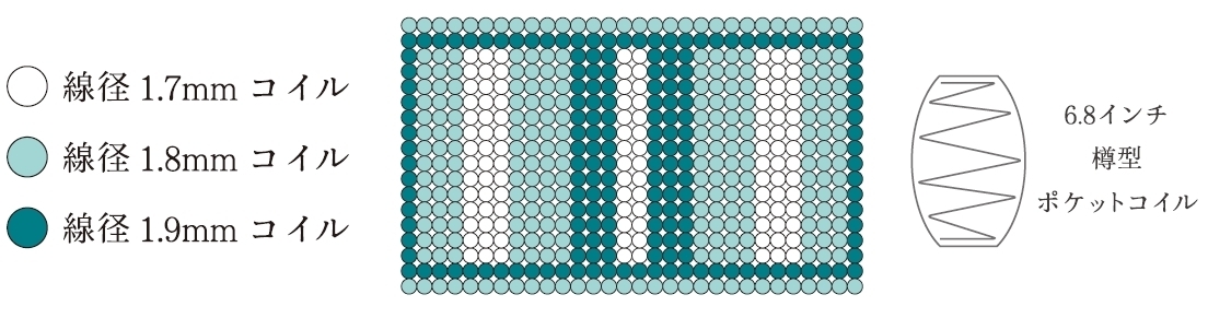 開発にあたっては、“濃い眠り”の実現を目指し、横になった際の体のラインや各部位にかかる荷重の違いに対して改めて焦点を当て、様々な角度から検証を重ねて参りました。その結果辿り着いたのが、「11ゾーン」というこれまでにない革新的なゾーニング配列です。1枚のマットレスに線径の異なる3種類のポケットコイルを使用する事で、従来は落ち込みを防ぐ為に硬めのポケットコイルを配置していた肩や臀部といった荷重がかかりやすい箇所の一部に、あえて柔らかいポケットコイルを配置する事が可能になり、体圧分散性を向上。体のラインを隅々まで優しく支え、今までに味わったことのないきめ細かな寝心地を実現しています。また、コイル自体のクッション性能を存分に発揮すべく、ポケットコイルは6.8インチ高を採用しています。