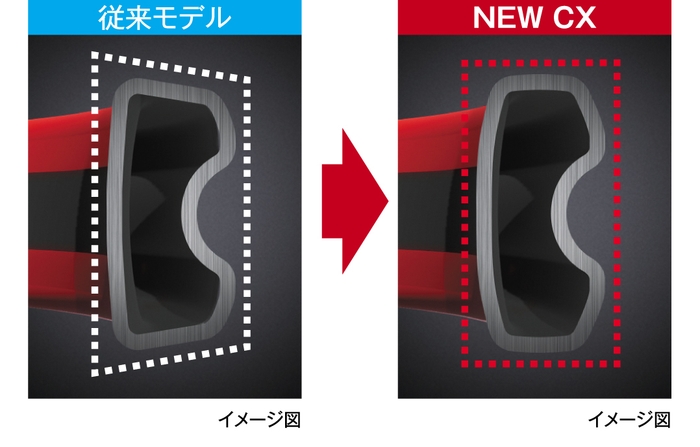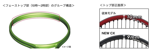 NEW「CX」シリーズは、ボックス形状ラケット特有の掴むような打球感に加え、従来モデル以上のパワーとスピン性能をあわせ持つラケットを目指して開発されました。新設計のフレーム形状とストリングパターンを採用してパワー・スピン性能を向上させながら、フェース部とフレーム部の剛性を調整することで安定性とより柔らかな打球感・ホールド感を実現しました。さらに、振動吸収性に優れた材料を採用することで従来モデル以上の快適な打球感を実現させ、ストリングでボールを掴むような感覚“キャッチ・フィーリング”を体感できます。