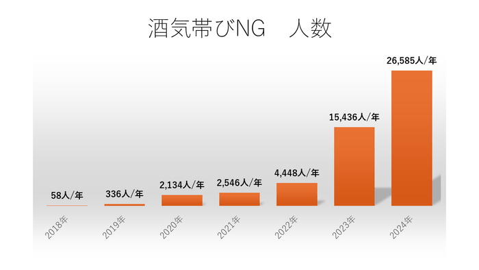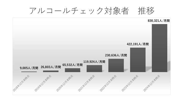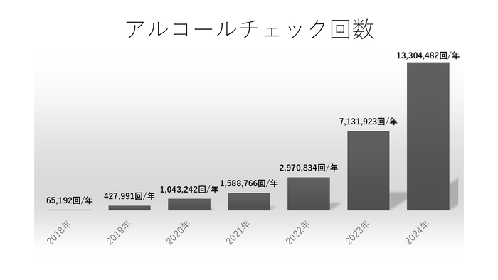開始当初は月間1万人未満でしたが、6年目を終え、現時点で月間約80万人がクラウドアルコール検査を利用しています。2024年既存契約緑ナンバー事業者の飲酒検査分に加え、白ナンバー義務化開始から1年分が加算され、年間で1300万回以上の飲酒検査が行われた年となりました。