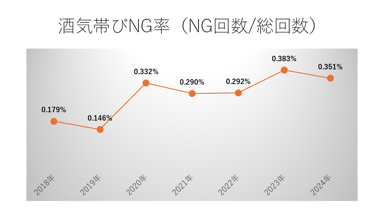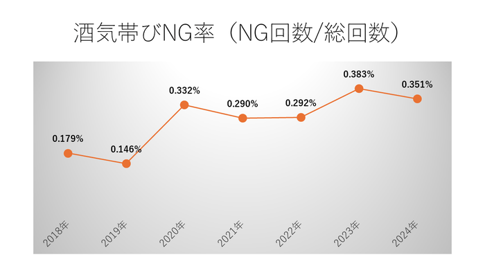 白ナンバーのアルコール検知器義務化施行から1年たったことから、過去5年のアルコール測定者、回数、酒気帯びNG数、NG率をとりまとめました。