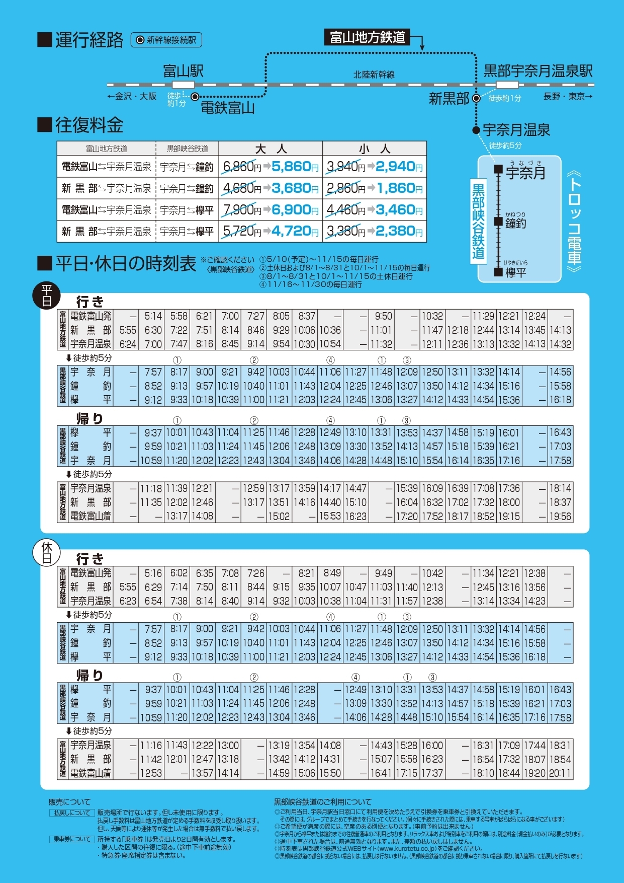 ※新黒部駅が無人の場合、終点宇奈月温泉駅改札にて「おトクに黒部峡谷へ行こうよ!きっぷ」購入を駅員に伝えてください。