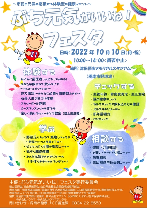 山口県周南市は、市民の元気を応援する体験型の健康イベントとして「ぶち元気がいいね!フェスタ」を、2022年10月10日(月)に津田恒実メモリアルスタジアム(山口県周南市)で開催しました。