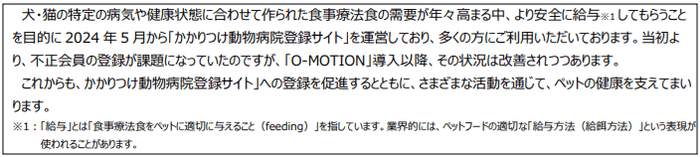 共立製薬は、ロイヤルカナン ジャポン合同会社が製造する食事療法食の販売代理を担っており、2024年10月から同製品の購入方法を見直し、安全かつ適正な流通体制の構築を行いました。こうした背景のもと、共立製薬は2024年5月22日に「かかりつけ動物病院登録サイト」を公開し、飼い主によるペット情報やかかりつけ動物病院の登録を通じて、獣医師の指導を受けた方のみに製品が届く仕組みを整備されました。