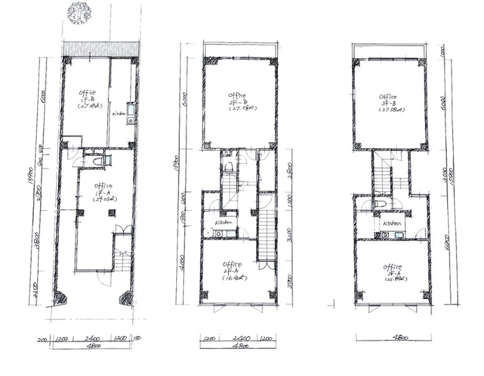 3階建ての鉄骨造。各階に共有の給湯スペースがあり、各スペースは好きなテイストで改装できます(1階2カ所、2階・3階共有スペース改装済み)