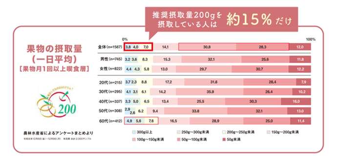 日本におけるフルーツ摂取量は年々減少傾向にあります。厚生労働省と農林水産省は「食事バランスガイド」にて、フルーツの摂取目標量を1日200gと定めていますが、フルーツを一日平均200g以上摂取できている人は全体で約15%しかいません。可食部のみで計算すると日本人の平均フルーツ摂取量は96.7gであり、推奨されている1日200ℊの摂取量を大幅に下回っているのが現実です。