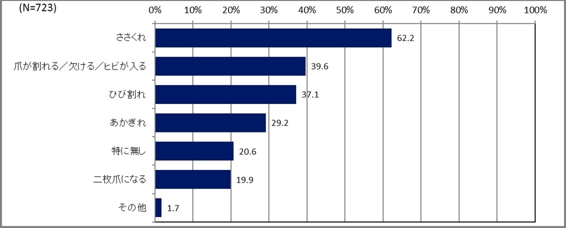 具体的な悩みとして「ささくれ」を選んだ方は60%以上にものぼり、次いで「爪が割れる/欠ける/ヒビが入る」が2番目に多いことが分かりました。