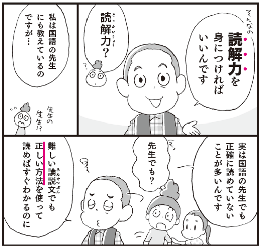 その主宰でありカリスマ講師の著者が、二十数年にもおよぶ講師生活の中で築き上げた 独自メソッドを用いて、10日間で読解力を飛躍的に上げる方法をマンガで解説した1冊です。