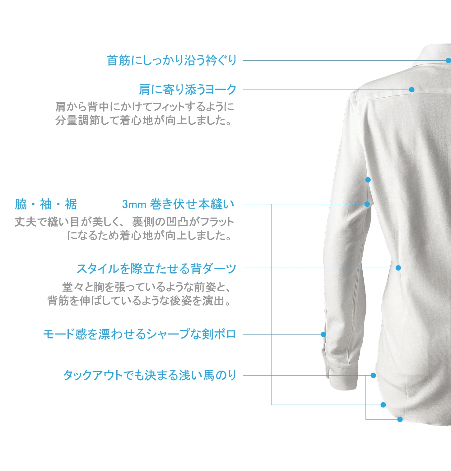 decollouomoの作り出すシャツの最大の特徴は、その着心地です。まるで第二の肌をまとっているかのような自由度、そして軽くストレスのない着心地。その感動は結果へとつながり、そして信頼へとつながるでしょう。