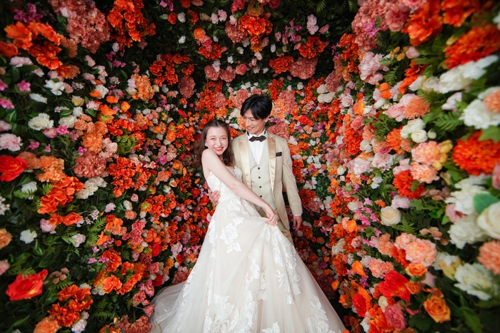これまで提供していた店舗ごとに異なる9種類のフラワーウォールに、新たなフラワーウォールが仲間入り。オレンジ色の花々が周囲を取り囲むように広がる、迫力満点の撮影が叶うフラワーウォールです。