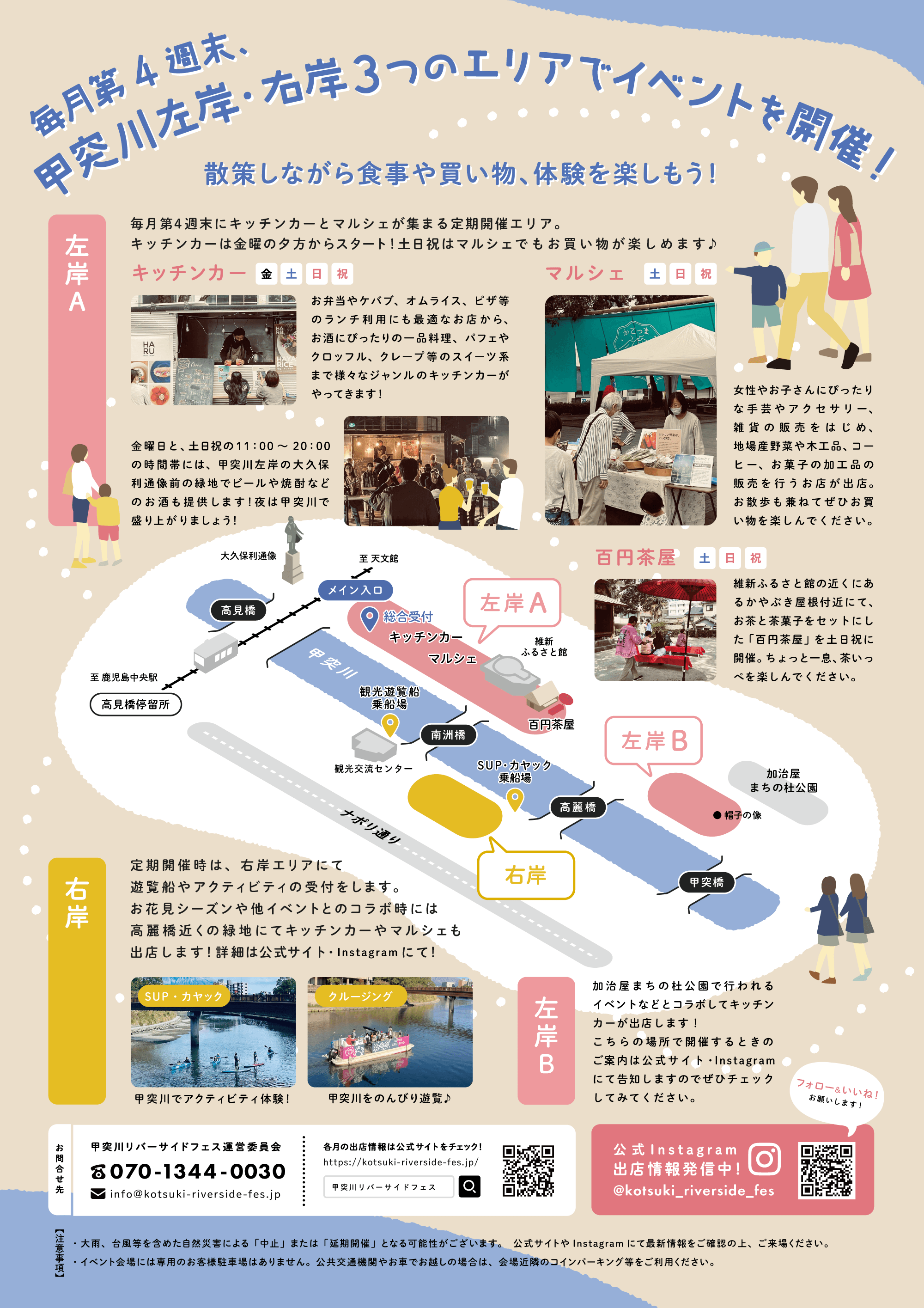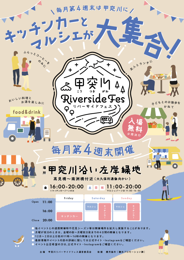 甲突川リバーサイドフェス運営委員会では、鹿児島市維新ふるさと館周辺の甲突川左岸緑地(大久保利通銅像向かい)のエリアを中心に、毎月第4週末(金土日祝)にキッチンカーやマルシェが集うイベント「甲突川リバーサイドフェス」を2023年12月22日(金)から12月24日(日)まで開催いたします。