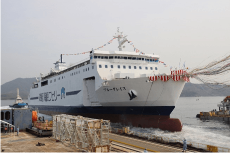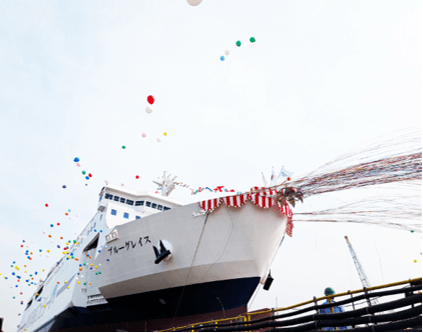 2025年3月27日(木)、内海造船株式会社の瀬戸田工場において、ブルーグレイスの命名式及び進水式が執り行われました。進水式とは、船が生まれて初めて海に浮かぶ瞬間であり、船としての誕生を祝い、航海の無事を祈る式典です。完成後の8月8日の就航に向け、船内設備等、現在も順調に工事が進んでいます。
