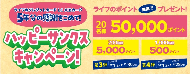 キャンペーン実施期間中にライフアプリからエントリーいただき、下記応募条件を満たしていただいたお客様から抽選で20名様に50,000ポイント、200名様に5,000ポイント、1,000名様に500ポイントをプレゼント!