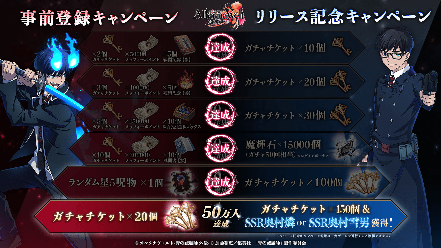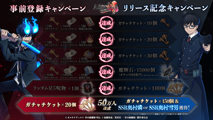 50万人突破で最大400回分のガチャチケットや、SSR 奥村燐 or SSR 奥村雪男が手に入る事前登録・リリース記念キャンペーンも開催中!