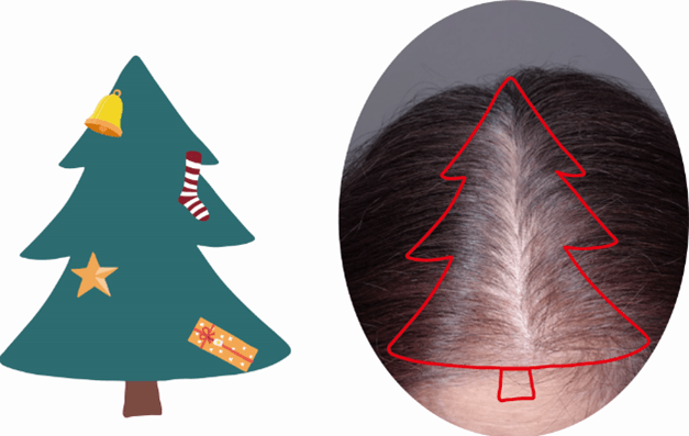 女性の壮年性脱毛症では、頭頂部の分け目に加えて前髪も薄くなることで、クリスマスツリーのような三角形に脱毛する「クリスマスツリー型」といった進行パターンもよくみられます。