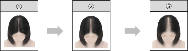 壮年性脱毛症とは、一般的に遺伝性の薄毛又は抜け毛で、ゆっくりと何年もかかって進行します。①の状態から抜け毛が進行し②に変化すると、壮年性脱毛症の可能性があります。さらに、進行すると、⑤のように頭頂部の広い範囲が薄くなることもあります。