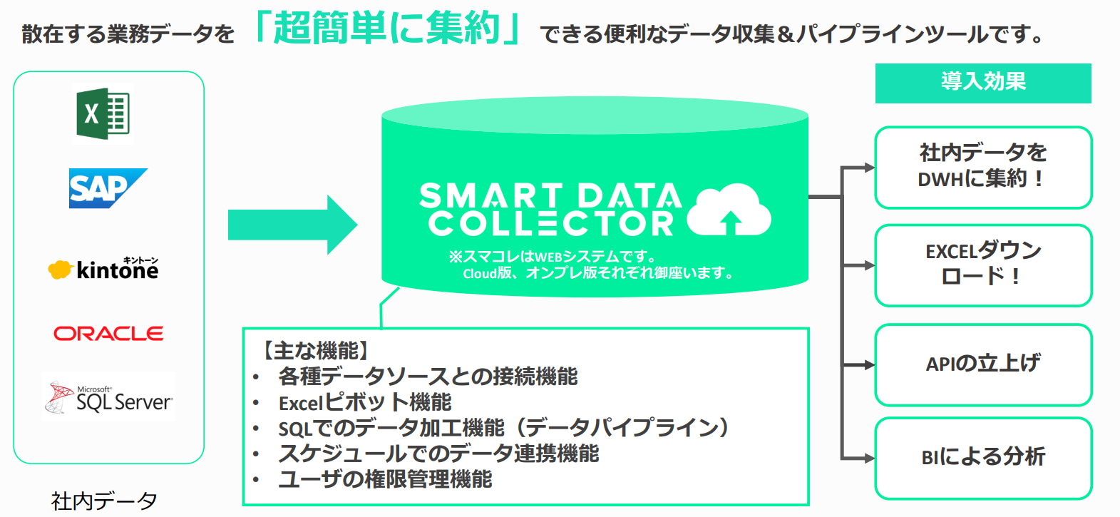 社内データを活用・分析するために一つのDWHに集約する場合、スマコレ for DBを使うことで開発不要で様々なデータソースと接続することができます。