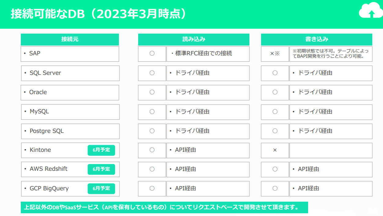 接続元のデータソースはリクエストベースで順次追加いたしますので、現時点で対応されていないシステムについてもユーザでの開発は不要です。