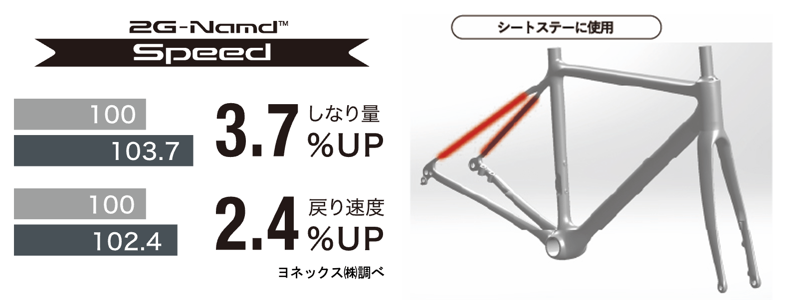 シートステーに新素材「2G-Namd™ Speed(ツージーエヌアムド スピード)※1」を採用し、静止時は通常カーボンと同等の剛性ながら、走行時はしなり量が増加し、しなり戻り速度がアップすることで、ペダリングのパワーを効率良く推進力に変えます。