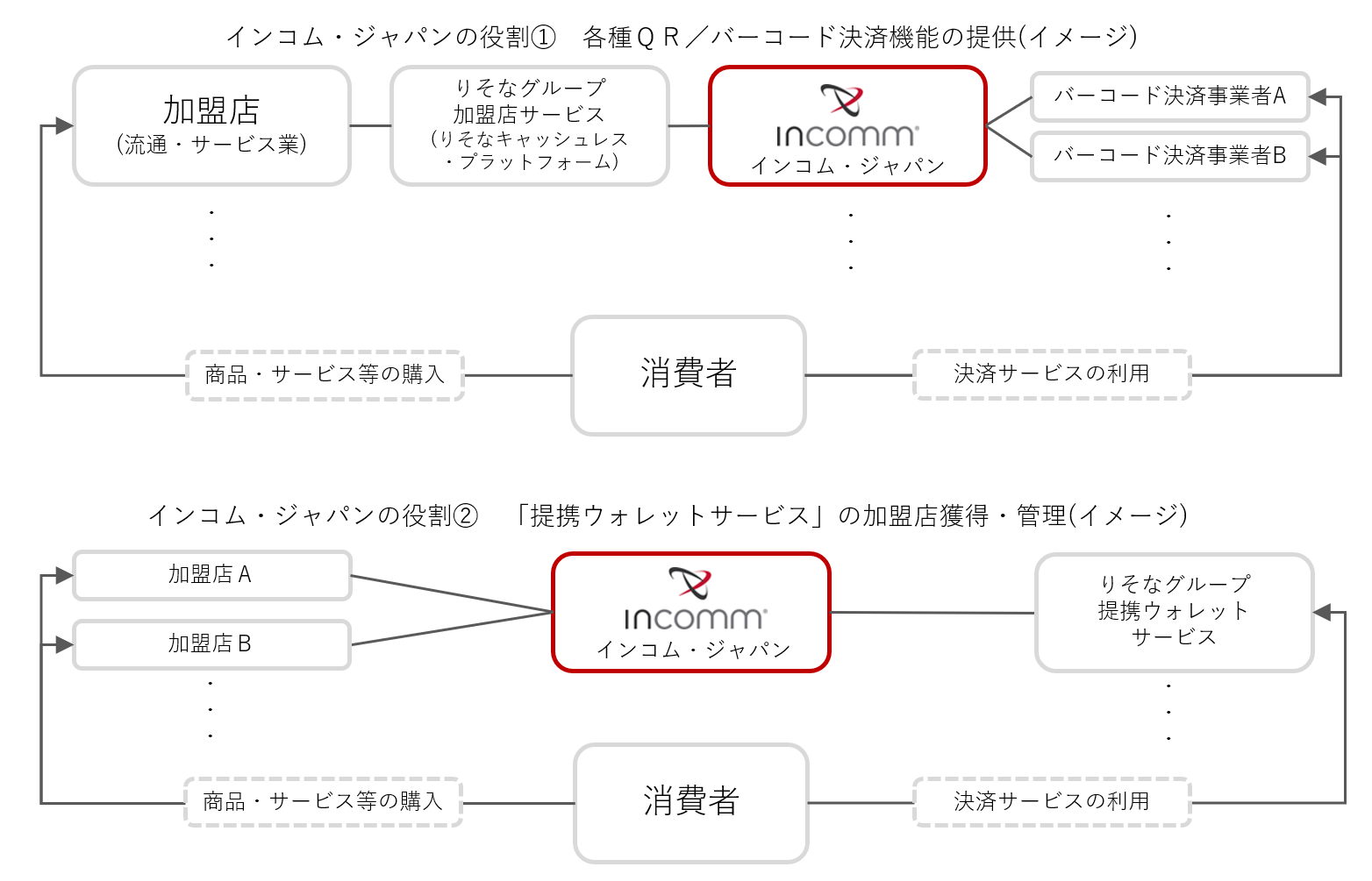 また、インコム・ジャパンが加盟店に提供しているQR/バーコード決済のシステムは、新しい決済事業者のサービスの追加が簡単にできるように設計されております。りそなグループが新たにサービスを開始するQR/バーコード決済「提携ウォレットサービス」を、既にインコム・ジャパンとシステム接続している加盟店や新規でシステム接続をする加盟店に対して導入を推進いたします。