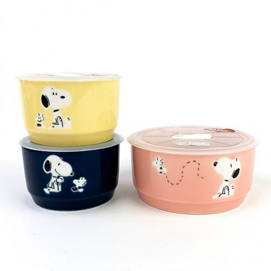 直径10cmほどの3色セット。蓋がきっちり閉まるので副菜などを冷蔵庫保存するときにとっても便利。しかも電子レンジ対応なんです!