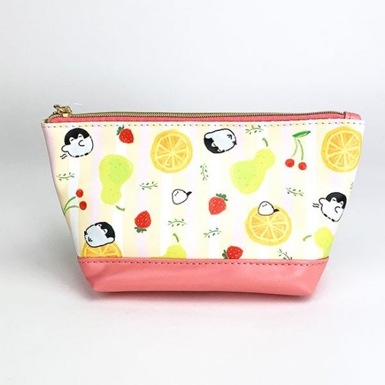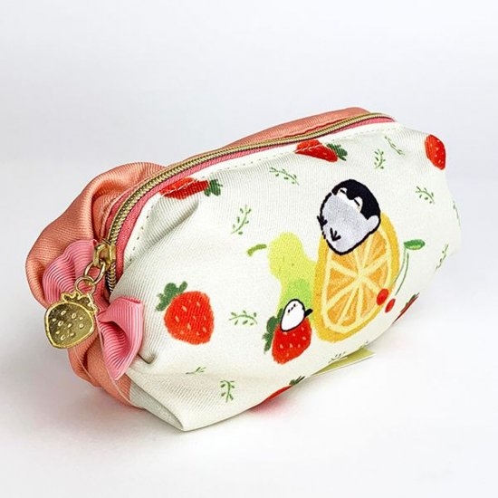 今回ご紹介するポーチは2種類です。まず1つめはこちらのフルーツいっぱいキャラメルポーチ♪フルーツにちょこんと乗った2匹が可愛すぎるデザイン。