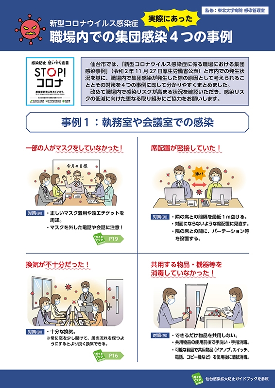 本事例集は、東北大学病院 感染管理室の監修のもと、11月27日に厚生労働省が公表した「新型コロナウイルス感染症(COVID-19)に係る職場における集団感染事例」と市内での発生状況を基に、職場内で集団感染が発生した原因として考えられることとその対策を、イラストを用いて4つの事例を挙げて分かりやすく解説している。