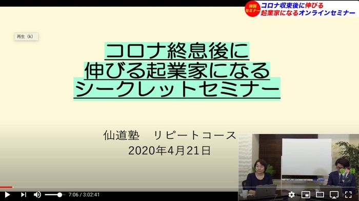 株式会社マーケティングフルサポート(所在地:東京都渋谷区、代表取締役:伊藤 慎吾)は、去る5月1日(金)19時30分より、当社代表の仙道 達也による『コロナ終息後に伸びる起業家になるシークレットセミナー』をYouTubeライブにて無料開催しました。