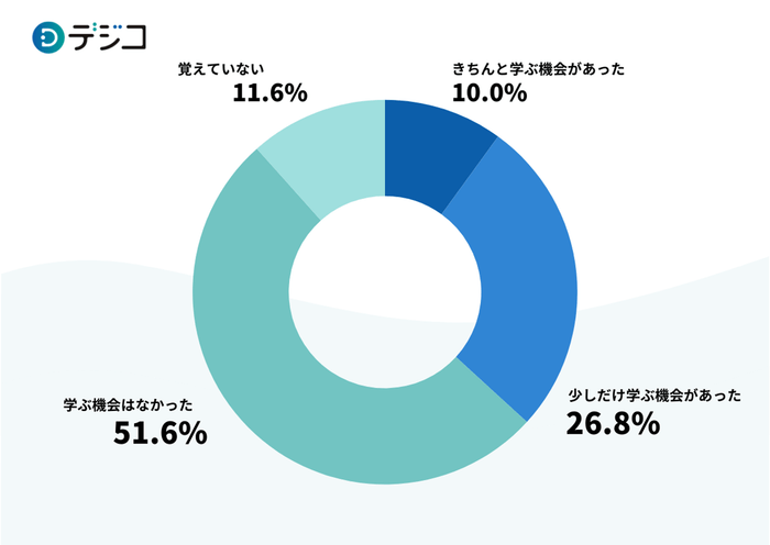 そこで、個人情報保護法について学ぶ機会があったかたずねたところ、「きちんと学ぶ機会があった」と回答したのはわずか10.0%で、「少しだけ学ぶ機会があった」という回答を含めても36.8%にとどまりました。6割以上の人が「学ぶ機会がなかった」「覚えていない」と回答し、個人情報保護法について学ぶ機会が少ないことがわかりました。