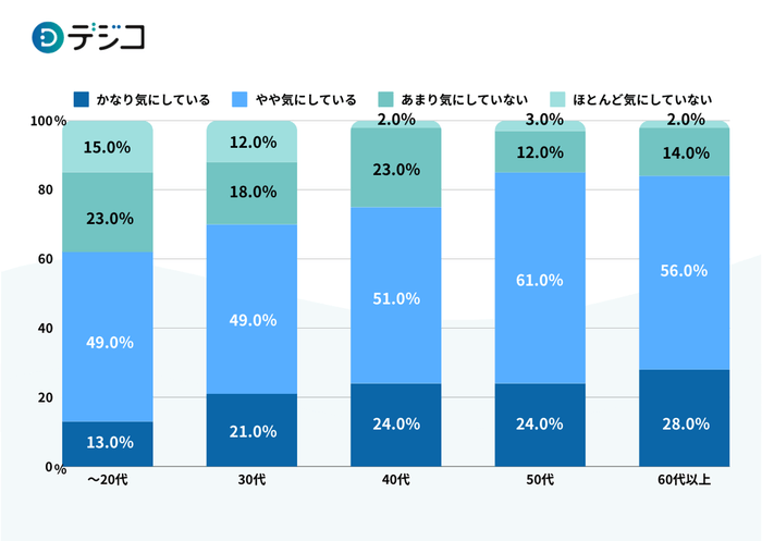 年代別で比較すると、年代が下がるほど「気にしていない」という回答が増える結果に。デジタルネイティブである若い世代ほどインターネット上での個人情報の提供への抵抗が少ないことがわかりました。