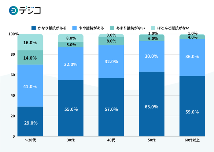 年代別で比較すると、年代が下がるほど「抵抗がない」割合が多くなる傾向が見られました。特に20代以下の若年層は、30.0%が「抵抗がない」と回答し、全体平均と比較すると16.8pt差と世代間ギャップが大きく見られました。