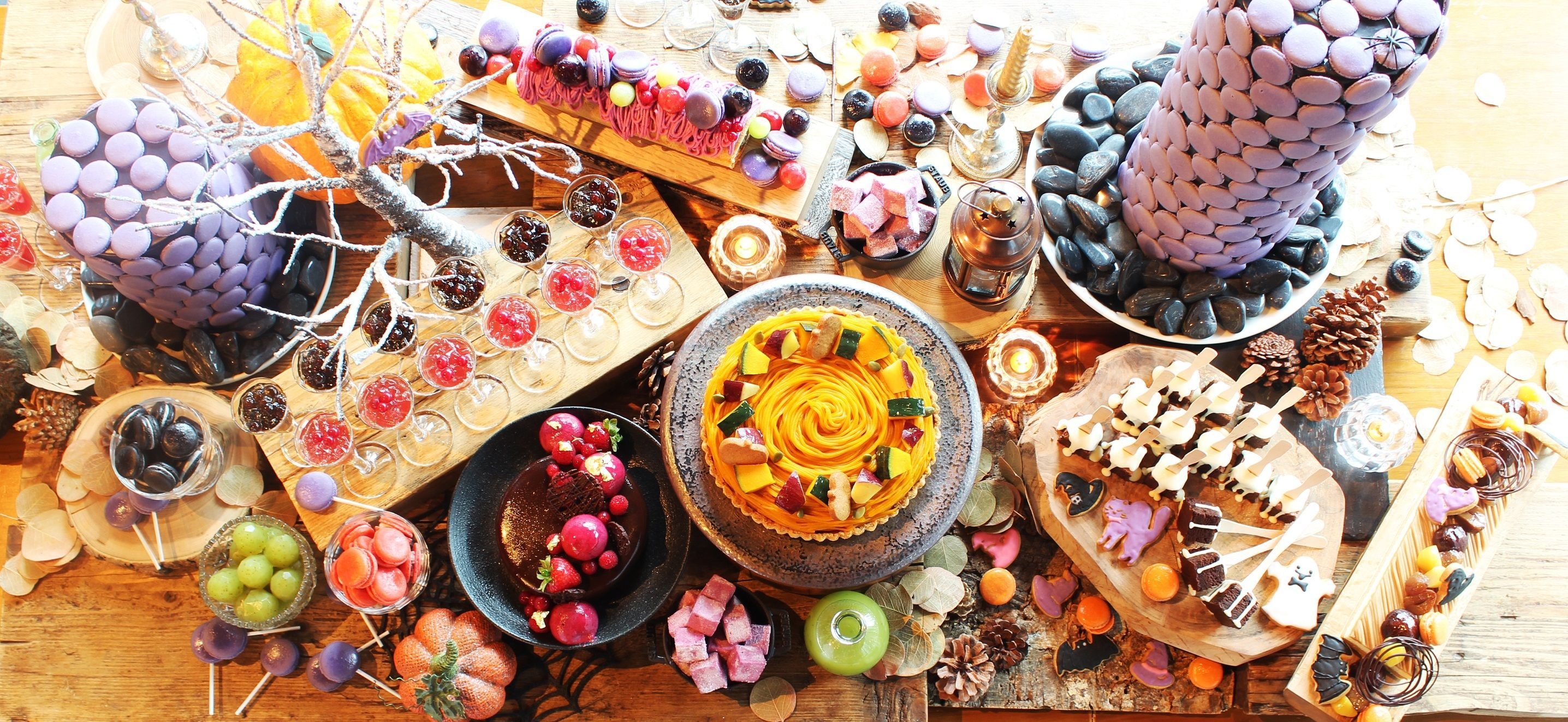 かぼちゃのモンブランタルト、ハロウィンカシスのパート ド フリュイ、パティシエ気まぐれ2層のムース、ハロウィンマカロン、紫芋のおばけメレンゲ、おばけクッキーとこうもりクッキー、魔女のサングリア、かぼちゃクリームのひとくちシュークリーム、コーヒーゼリー、しっとりガトーショコラ、ベリーのパンナコッタ 、フロランタン、チョコレートファウンテン、フルーツロールケーキ、ティラミス