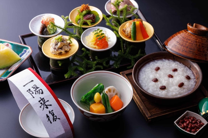 大祓え当日の朝には厄除け開運朝食を食べて、身体を内側から浄めます。赤い色に厄除けの意味があるとされる小豆の五穀粥や、語尾に「ん(運)」がつくことで縁起が良いとされる野菜の炊合せ「七福寄せ」*2を食べて、運気を向上させます。七福寄せの器を包む帯に書かれた「一陽来復(いちようらいふく)」とは、悪いことがしばらく続いた後に良いことが起こるという意味です。食前食後には神職が普段用いている感謝詞(かんしゃのことば)*3を読み上げ、厄除け開運朝食を食べることで、身体を内側から浄めます。
