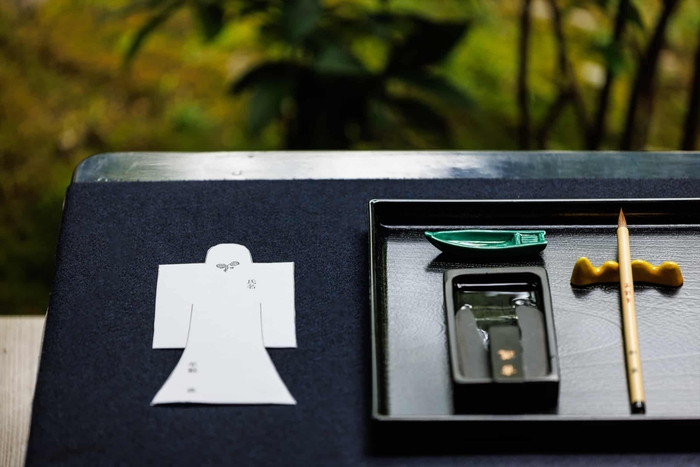 松尾大社での大祓え前日には、星のや京都で身を浄めて準備をします。客室に用意しているのは人形(ひとがた)と、松尾大社で祈りを捧げた御神酒(おみき)です。氏名と年齢を記入した人形で、身体を撫で息を吹きかけることにより、身に降りかかった穢(けが)れや災厄を人形に託します。穢れを託された人形は、松尾大社で祓詞(はらえことば)の奉上とともに祓い浄められたのち、浄火によって焚き上げられます。御神酒は客室風呂にいれて入浴することで、邪気を払い身を浄めることができるものです。星のや京都は、嵐山と小倉山に囲まれ、街の喧騒から離れた場所に位置します。渓谷を流れる大堰川のせせらぎや風の音が聞こえる静かな宿で一年を振り返り、滞在を通して心身を浄めます。