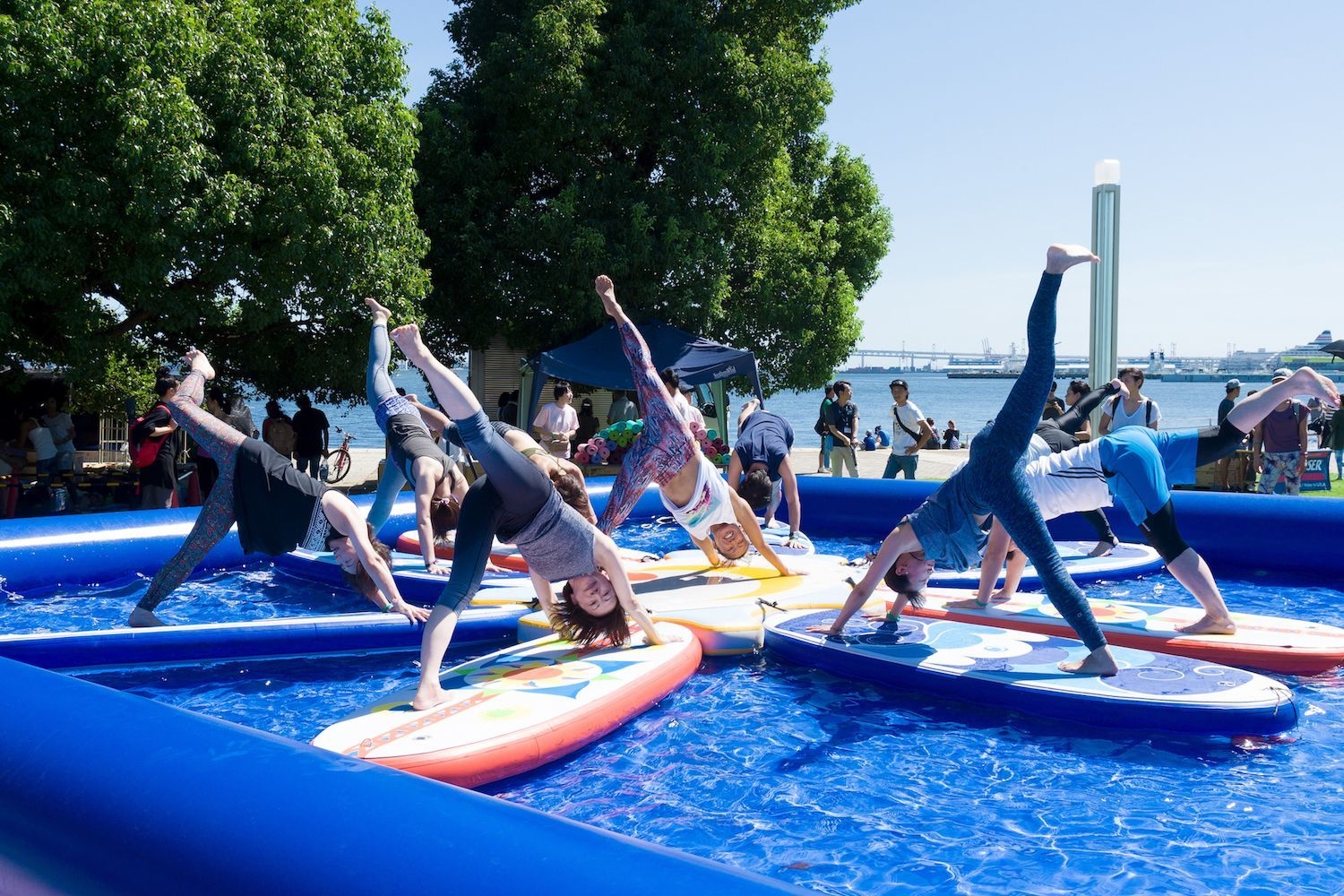 芝生の上に広大なプールを設置。その上で毎日SUPヨガ体験クラスを10クラス実施。