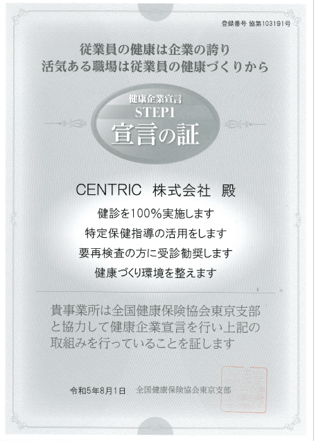 CENTRIC株式会社 健康経営の取組として 全国健康保険協会東京支部の「健康企業宣言」へエントリー、 「宣言の証」を取得