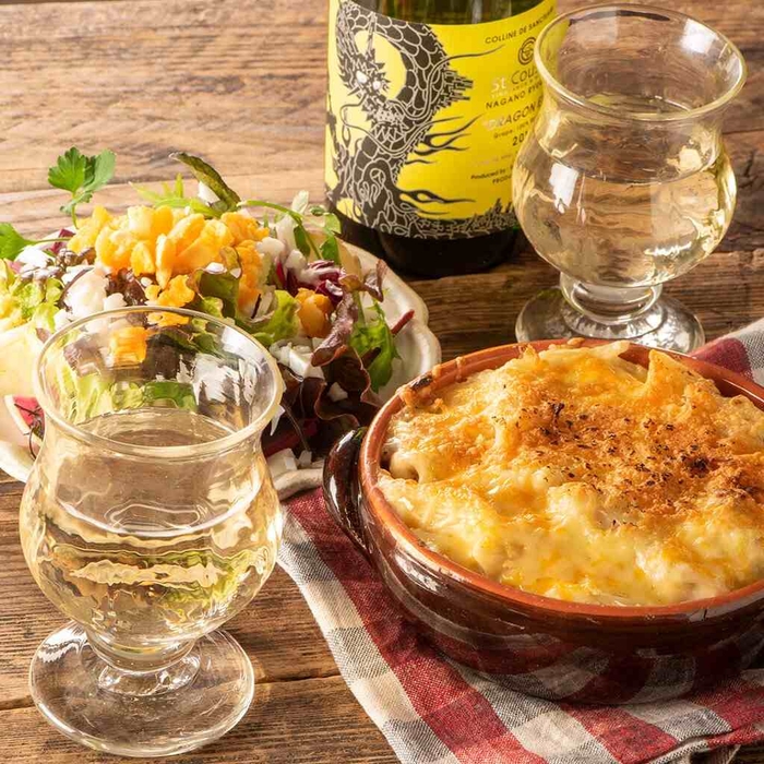 こっくりとしたテイストのお料理は、ほのかに酸味を感じるフレッシュな「長野竜眼」と相性抜群!蒸した野菜を「4種のチーズ&ベーコン」や「ディル香る ポテサラソース」にディップして、ワインで口を流すようにマリアージュさせるのがおすすめです。濃厚な味と素材の旨みを引き立てながらも、ワインの風味をしっかりと感じることができますよ。