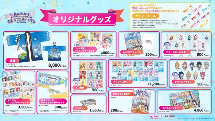 本イベント限定描き下ろしイラストも使った、オリジナルグッズ全12種を販売いたします。オリジナルグッズを合計2,000円(税込)以上お買上げの方に「ボディーシール」もプレゼント! イベント参加に加え、オリジナルグッズもぜひお買い求めください。