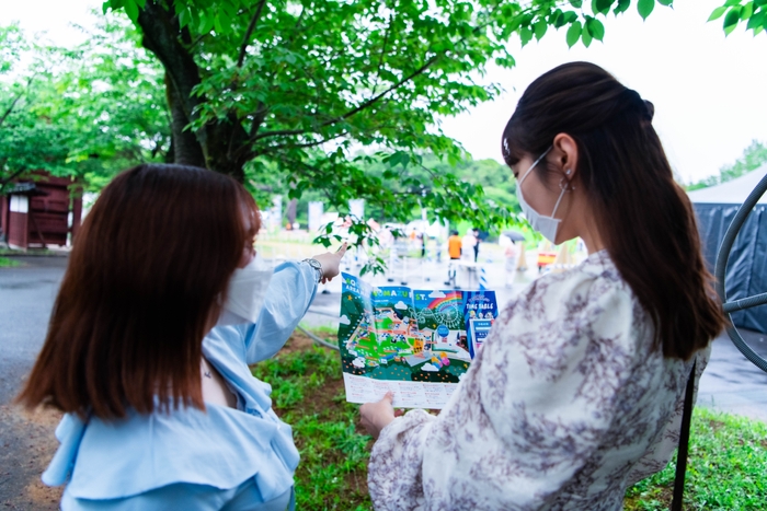 手のひらサイズの可愛いパンフレットを片手に、いざフェス会場となる広場へ。パンフレットの中は手書き風の描き下ろしイラストが散りばめられたマップや注意事項が書かれていて、これだけでひとつのグッズレベルのクオリティです。