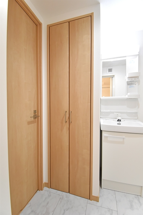 一般的な1Kアパートにはあまり見かけない洗面所収納を配置。