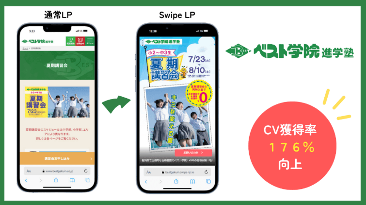 大手広告代理店を利用していたものの、CPAの高騰や申し込み率が低下し、入塾目標数を達成できていませんでした。Swipe LPを導入し、料金・講師紹介・口コミの各ページをSwipe LP化し、どのページから流入し、申し込んだかを分析しました。その結果、顧客のニーズを的確に捉え、広告施策にもフィードバック。CVRを176%向上させることに成功しました。