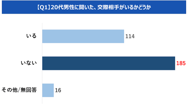 20代独身男性315人のうち「交際相手がいる」と回答した人の割合は、全体の約36%にあたる114人。いっぽうで、「交際相手がいない」と回答した人は全体の約59%にあたる185人となりました。