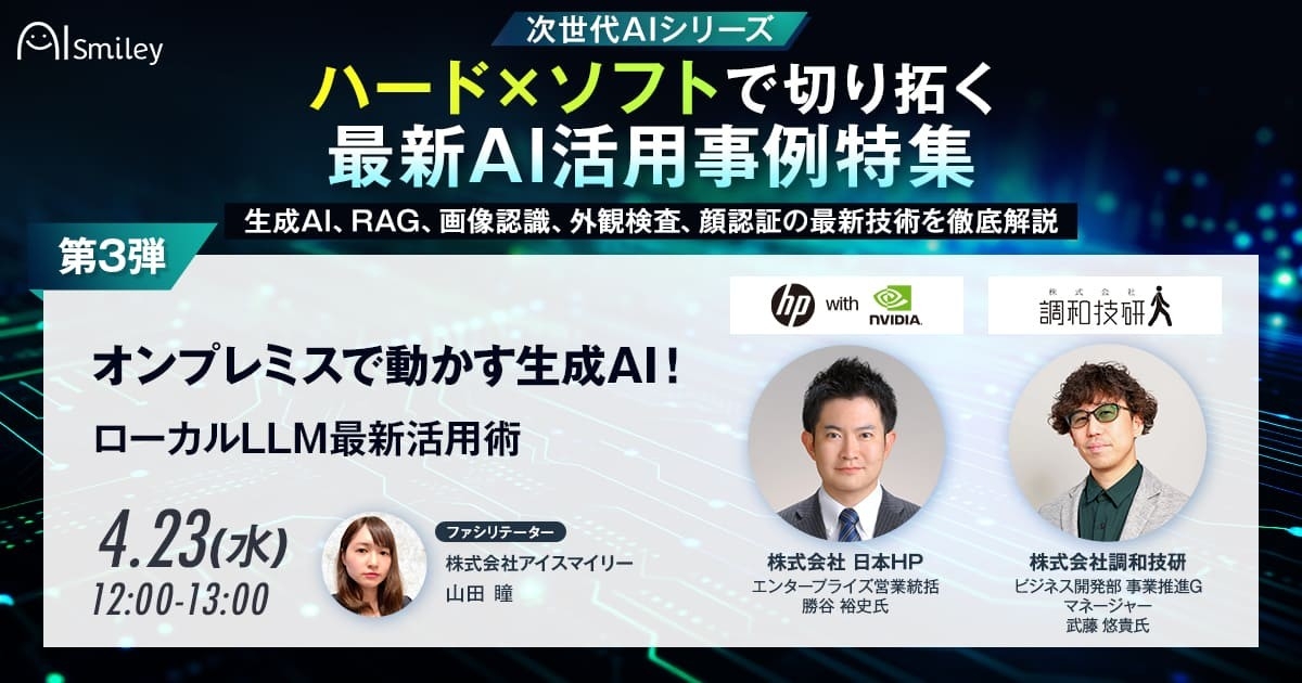 AIポータルメディア「AIsmiley」を運営する株式会社アイスマイリー(東京都渋谷区、代表取締役:板羽晃司)は、日本HPと最先端のAI企業を迎え、2025年4月17日(木)、2025年4月22日(火)~年4月24日(木)全4回開催の【次世代AIシリーズ】ウェビナーを開催します。