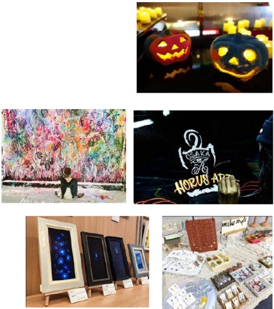 アート作品や雑貨の販売、ハロウィンワークショップを実施します。