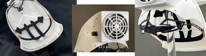 ・ヘルメット状のデバイスにエア流路を設け、⼩型ファンによって額上部からエアを噴出