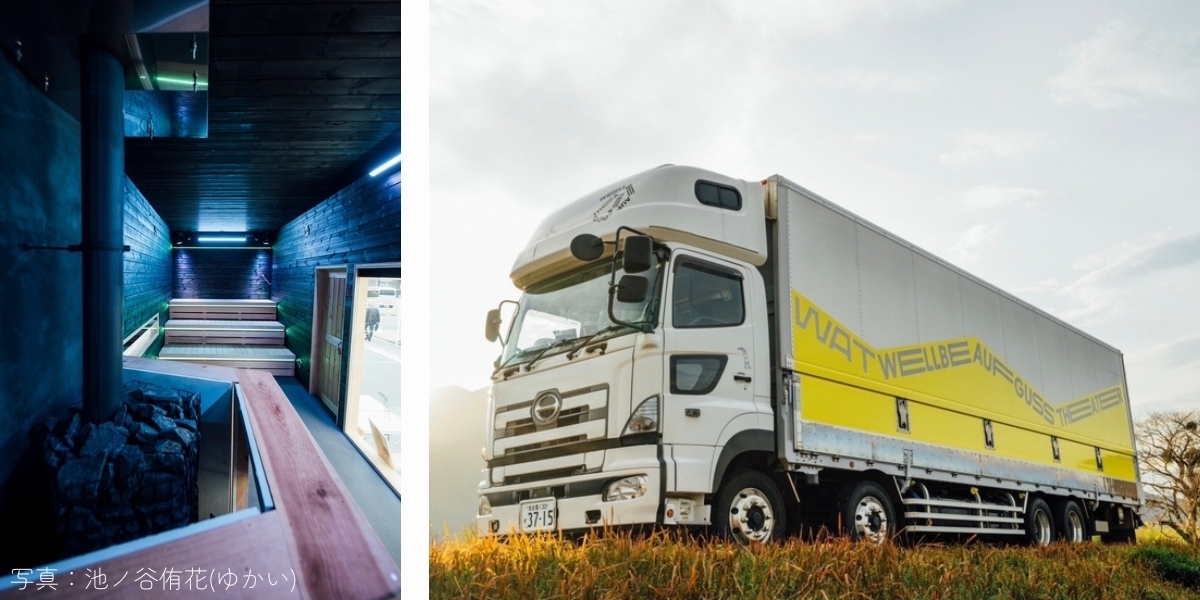 (2) 元10tトラックの車両はアウフグースに特化し、室内全体に響き渡る音楽やスポット・レーザー照明・LED照明などを搭載!座席は3段あり24名という大人数が一度にサウナ・アウフグース体験できる、日本に1台の『WATら』
